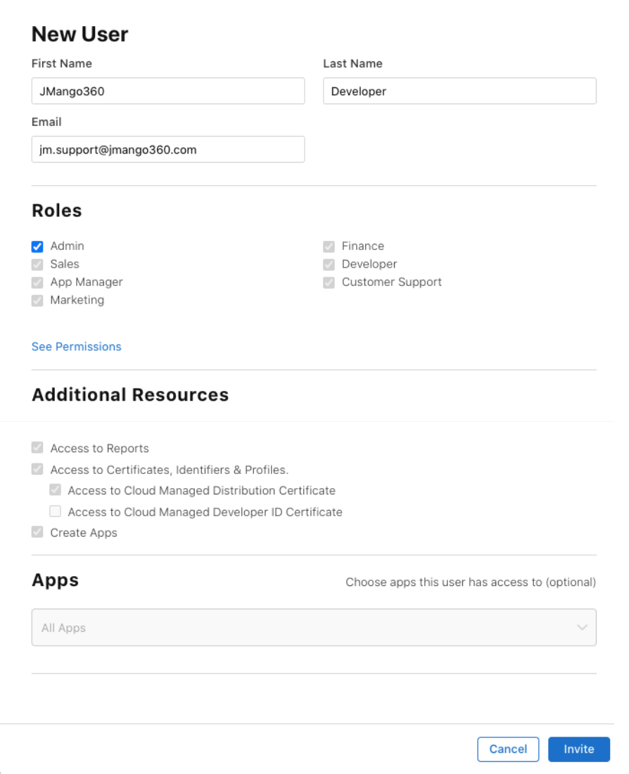 - The Admin role will provide JMango360 with enough access to all required resources.