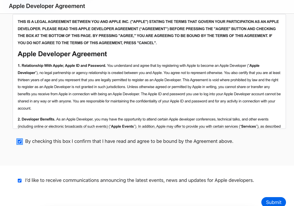 Step 2: If prompted, review the Apple Developer Agreement and sign off by checking the box, and then click Submit.