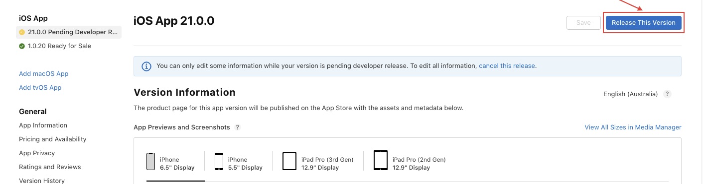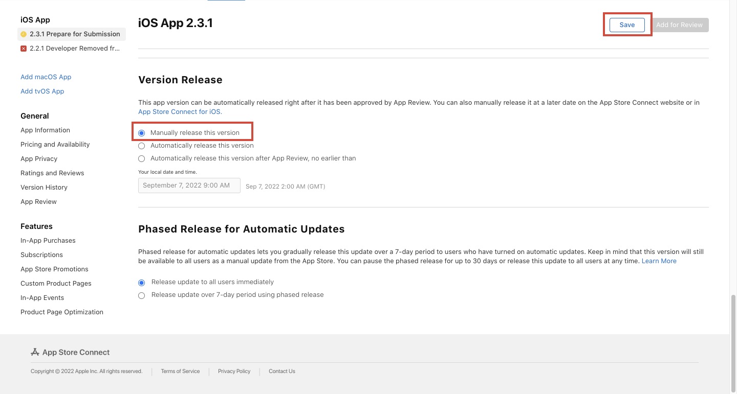 In the Version release area, click on the checkbox Manually release this version then click Save in the upper right corner.