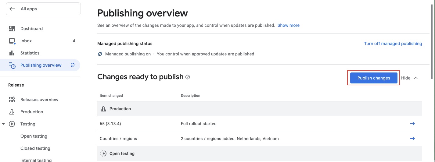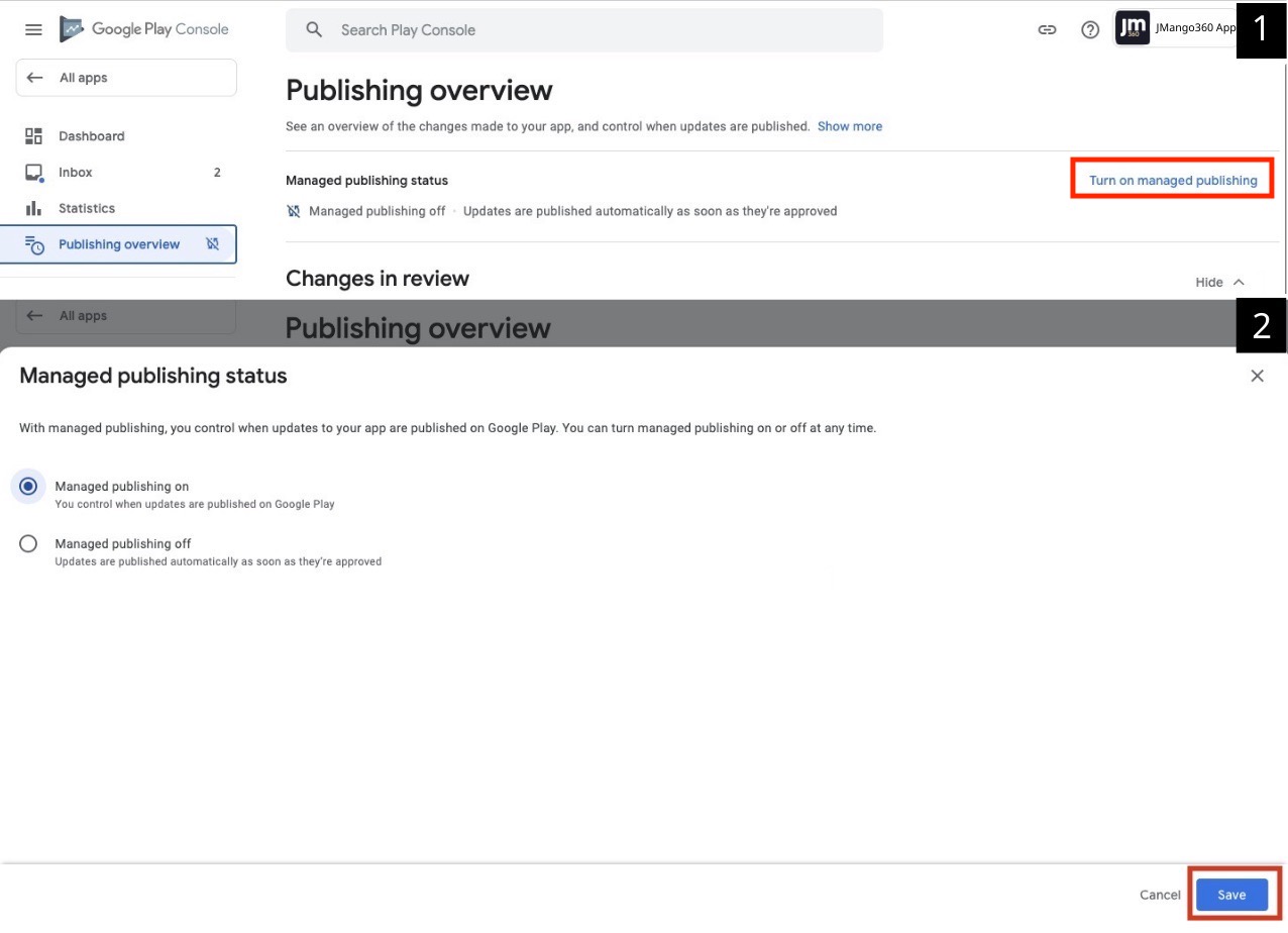 - Managed publishing on (You control when updates are published on Google Play - manual release)