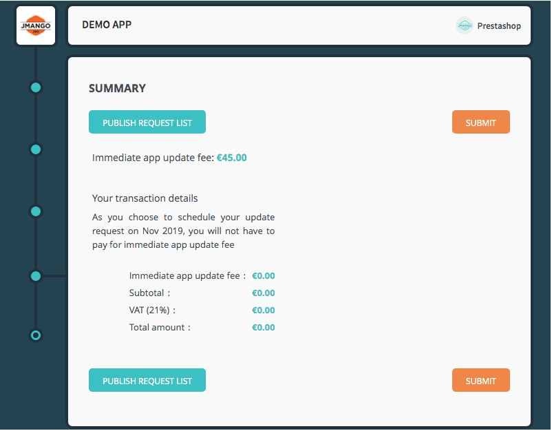 Please review all the information and click Submit to submit the request. And you're done! We receive your request and will schedule your app re-publishing.