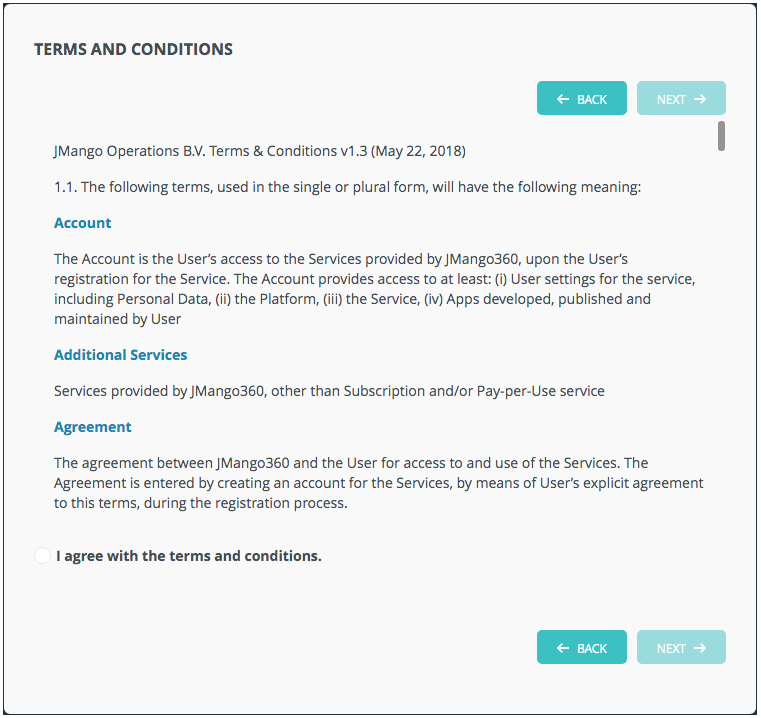 Step 2: Read the Terms and Conditions and select the check box to agree to the terms and conditions, then click Next.