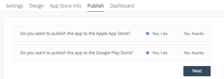 Step 2: Navigate to Publish module. You are asked to choose the stores to which you want to re-publish the app. As you select Yes, I do to either of the questions, if you miss any required App Store information, you are prompted to provide the missing information before you can continue. Once all required information is provided, click Next to proceed.