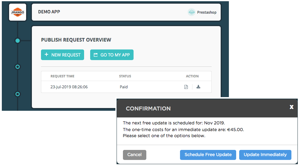 - Update Immediately: This request costs you a fee for one-time update. After receiving the request, JMango360 will prepare to re-publish the app as soon as possible, without waiting for the schedule.
