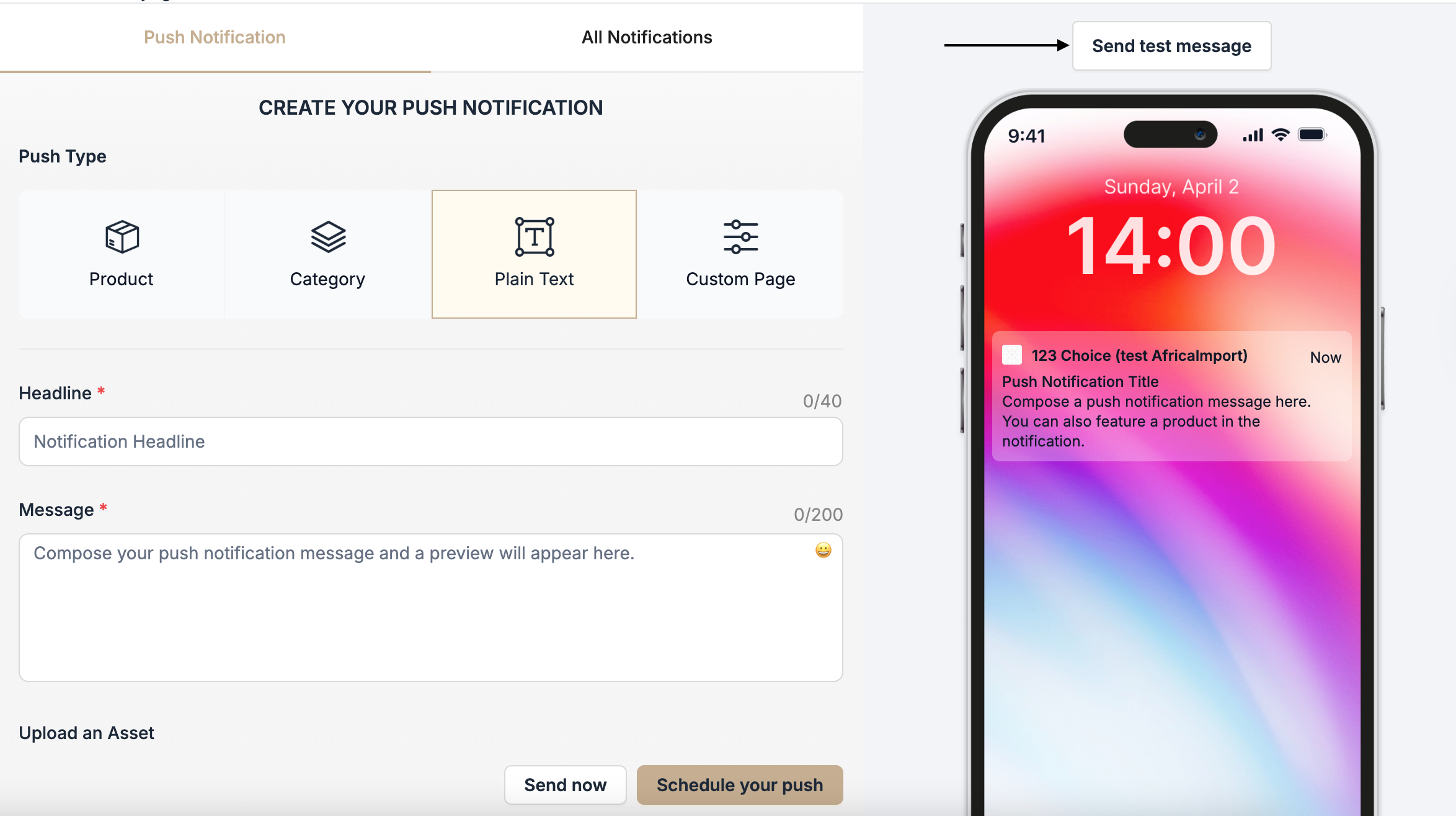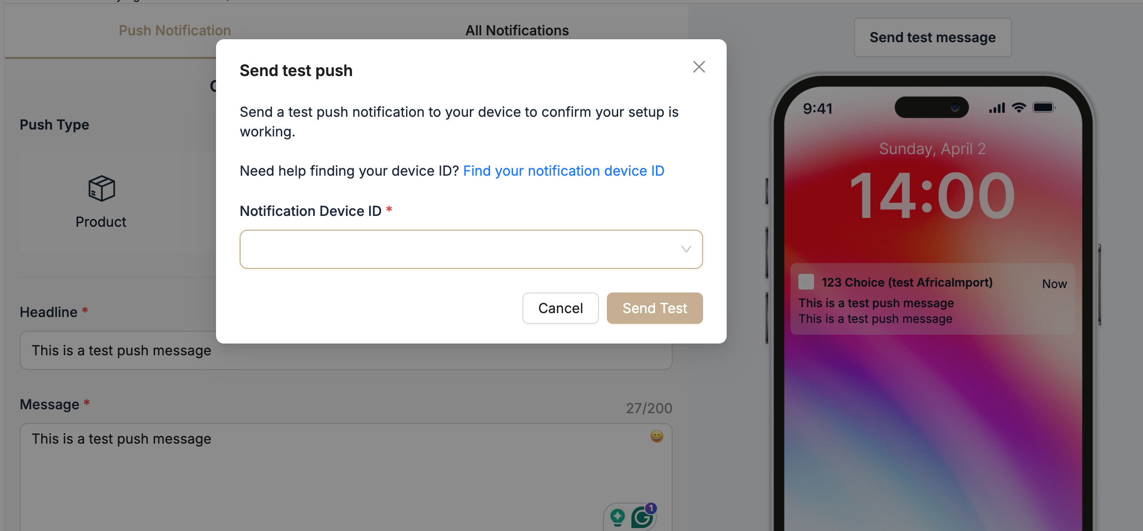 Sending a test push notification is an essential part of ensuring your push notifications are set up correctly and working as expected. This process allows you to confirm that your setup is functioning before you send out live notifications to your users. Follow the steps below to send a test push notification using the Notification Device ID.
