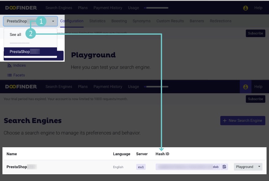 hashid identifies your search engine in Doofinder's servers. It can be found in the list of each engines in your