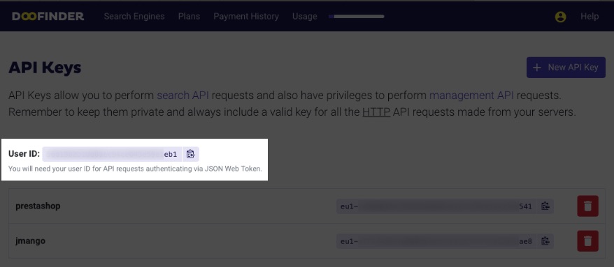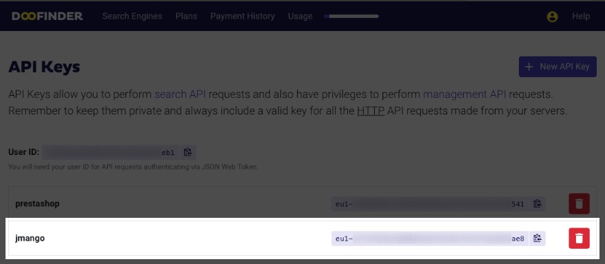 Doofinder Control Panel > My Account > API Keys. Please help to create an API key for the integration with JMango360 and provide us with the token.