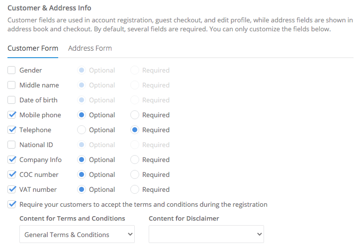 - Company Info: Customers can create private or business accounts. While private accounts require no company information, business accounts call for company name (always required), COC number (optional or required), and TAX/VAT number (optional or required). In the backend, when you disable Company Information, you allow customers to create private accounts only. When you make this field optional, customers can choose between private and business accounts using the Customer Type field on storefront/mobile app. When you make this field required, you limit customers to business accounts only.