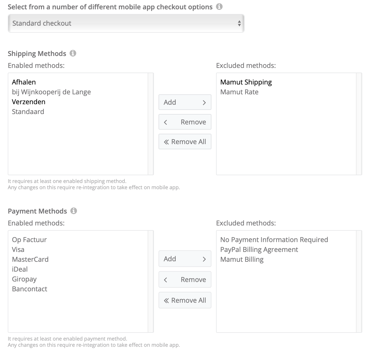 In standard checkout, all available shipping and payment methods in your webshop are imported to your app. Depending on technical limitation and your business, you can enable all shipping/payment methods or disable any mobile-unsupported method or any method you do not want to include in the app.