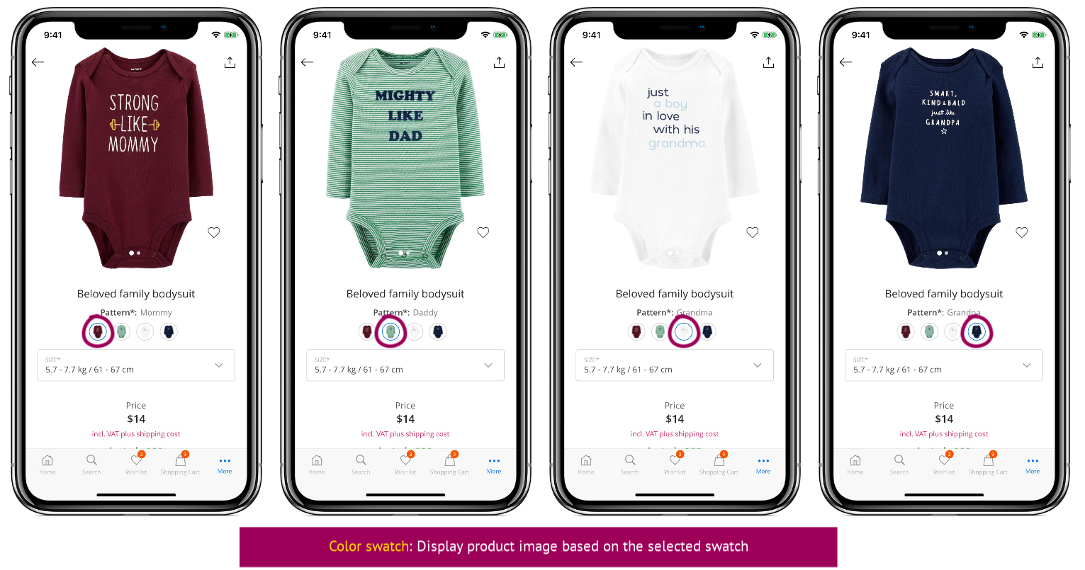 color swatches are available as part of Magento's built-in functionality. Enable this setting so your app will show product attributes as color swatches.