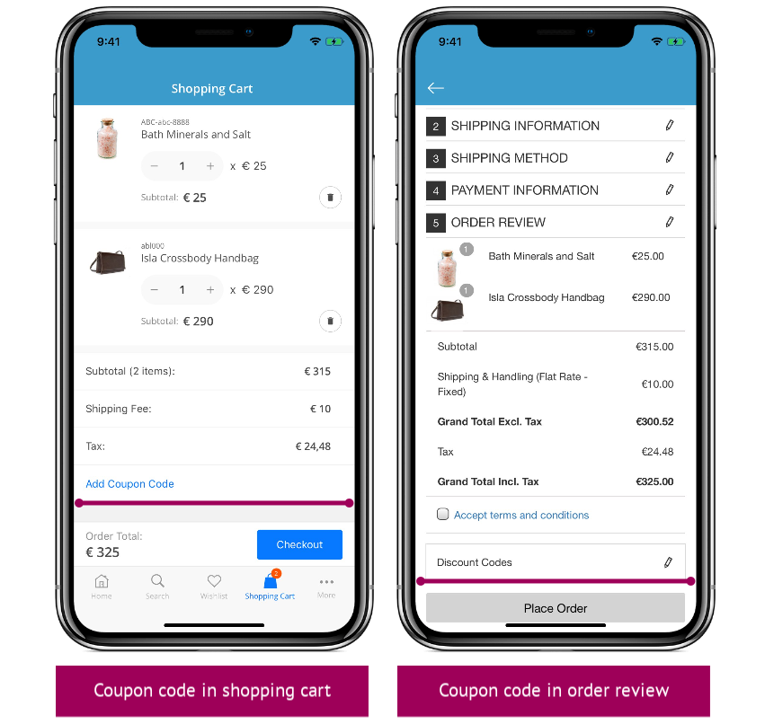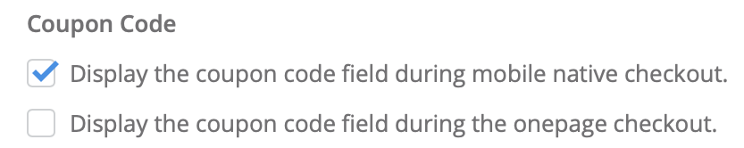 - Display the coupon code field during mobile native checkout: Show the coupon code field in the shopping cart and native checkout.