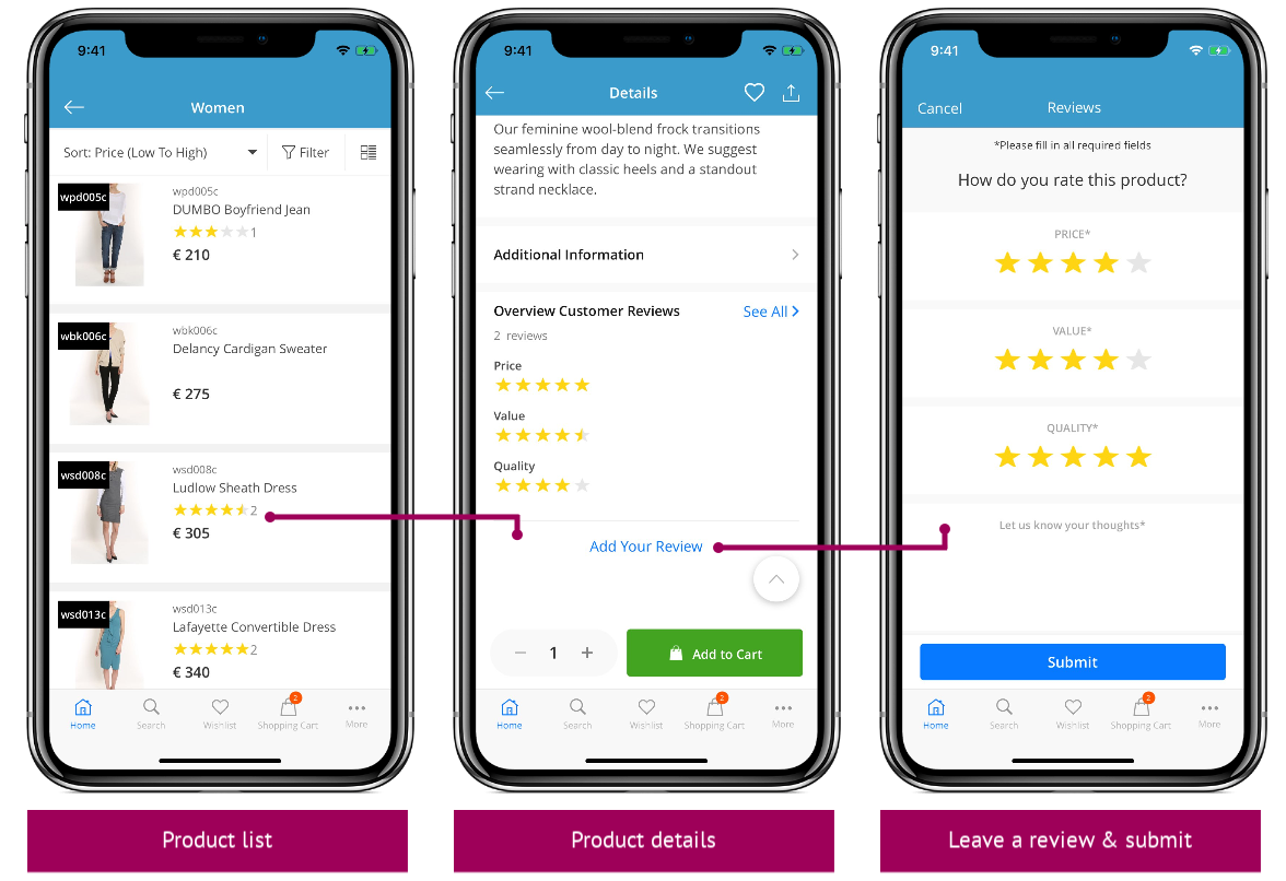 Product ratings and reviews play an important role in building new customers' trust in the PWA and the brand. When enabled, your PWA users will be able to view star ratings and reviews in product list and product details. They can also submit product reviews in the Reviews section in product details.