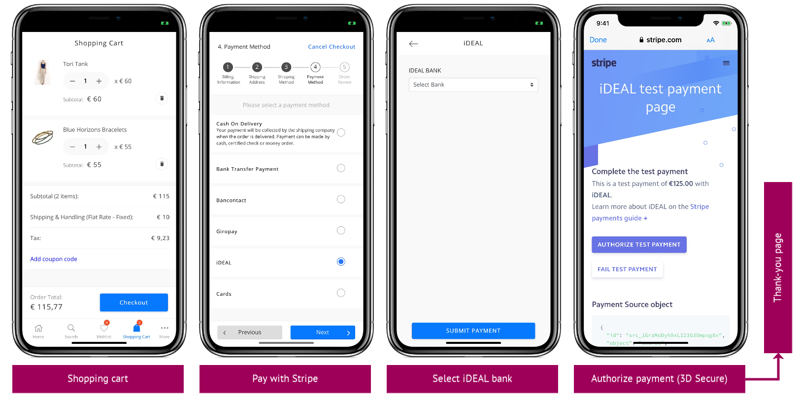 Stripe native payment makes it quick and easy for app users to buy on mobile. Similar to Braintree, Stripe native payment also offers app users to save their card information for future use. Supported payment methods: Cards, Bancontact, iDEAL, and SOFORT.