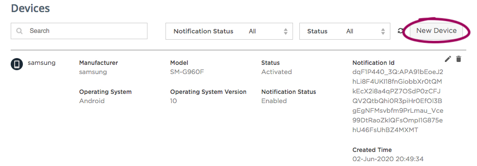 Devices can only receive push notifications when the Device Status is Activated, the Notification Status is Enabled and the Notification ID has its value instead of displaying N/A.