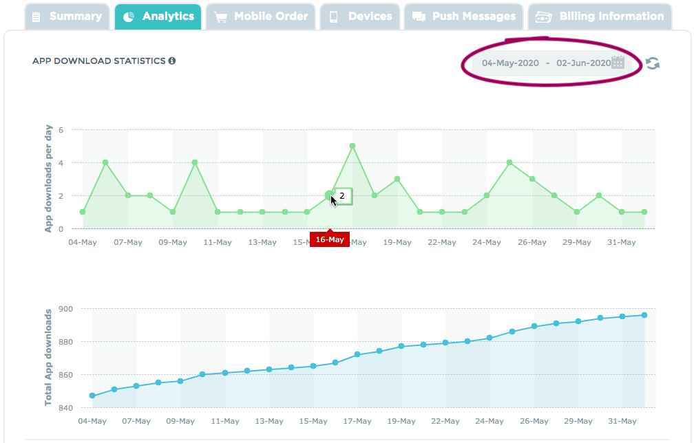 App download statistics show the number of devices (according to the device keys) that have your app installed. You can view the total app downloads and daily app download in two line charts. To view the data of each day, just hover over any of the points in the chart to see the hover label appears displaying the data you want.