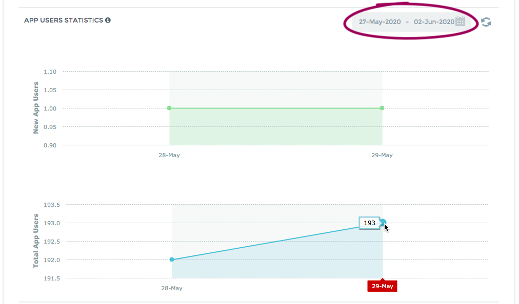 App user statistics show the number of users, including both registered users and guests, who use your app. You can view the total app users and new app users per day in two line charts. To view the data of each day, just hover over any of the points in the chart to see the hover label appears displaying the data you want.