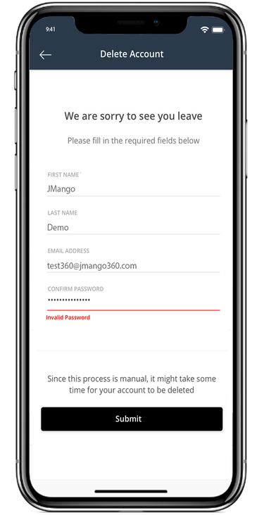 As the merchant, you need to add an email address to the Account Deletion feature on JMango360 Control Panel. When users complete the Account Deletion form on the mobile app, an email notification will be sent to the email address above. You need to delete the account on your e-commerce backend to complete the deletion.