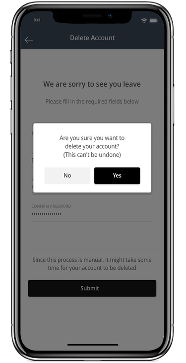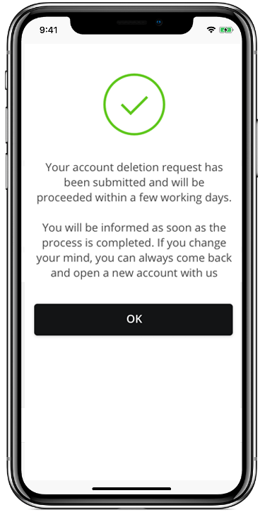 Merchants can enable the account deletion option on their website, and account cancellation can be made via the website or the mobile application. The account deletion procedure will begin when the user requests to remove the account, after which their information will be forwarded to the merchant's email address so that the absolute account deletion may occur.