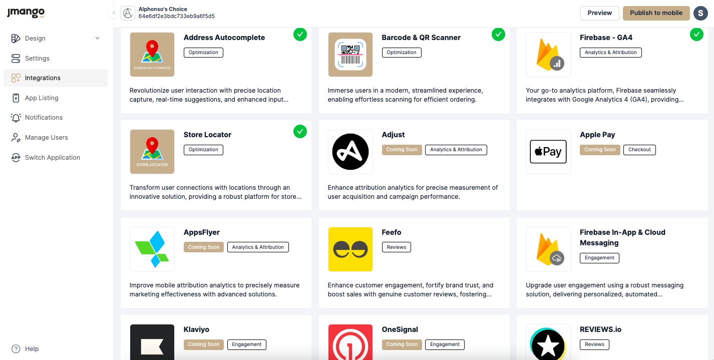 Note: Regarding setting up these integrations, some integrations can take effect right away once enabled, but some require additional actions such as a new mobile build or contacting JMango360 for alignment. See more information in the related articles for each integration.