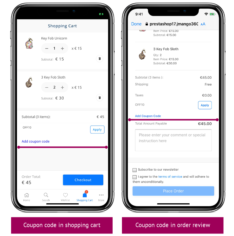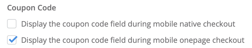 - Display the coupon code field during mobile native checkout: Coupon code field will be added to the shopping cart.