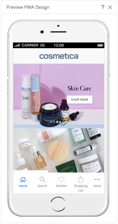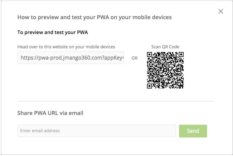 In JMango360 Back Office, please click the Test on Mobiles button at the top right of the screen to open the instruction for PWA preview. You can use a URL or scan the QR code to open the PWA on a mobile browser. You can also share your PWA with colleagues and customers via email.