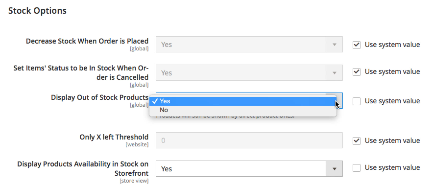 - Out-of-stock products: Out-of-stock products can be hidden using the setting in Magento Admin > Stores > Configuration > Catalog > Inventory > Stock Options. If you want to display out-of-stock products on app, make sure those products are also shown on website by disabling the setting in the screenshot below. Don't forget to re-integrate app to be 100% certain that all the changes in website backend apply to the mobile app.