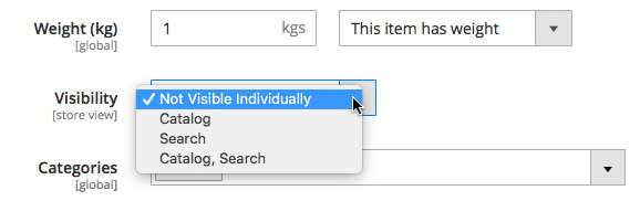 - Product visibility: Make sure that the visibility of your products is 'Catalog, Search' or 'Catalog'. Otherwise, products will not show in product categories on app. To change the product visibility, go to Magento Admin > Catalog > Products and find the Visibility attribute in a certain product page. Don't forget to re-integrate app to be 100% certain that all the changes in website backend apply to the mobile app.