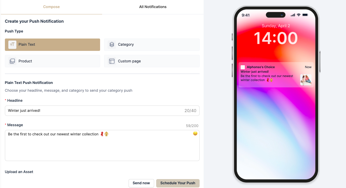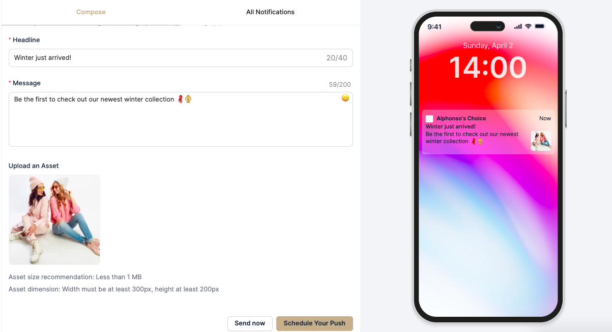 Craft a brief and compelling headline and message. Keep in mind the character limit in both the headline and message fields. For more tips on creating effective and engaging push notification content, please read Best practices for push notifications.