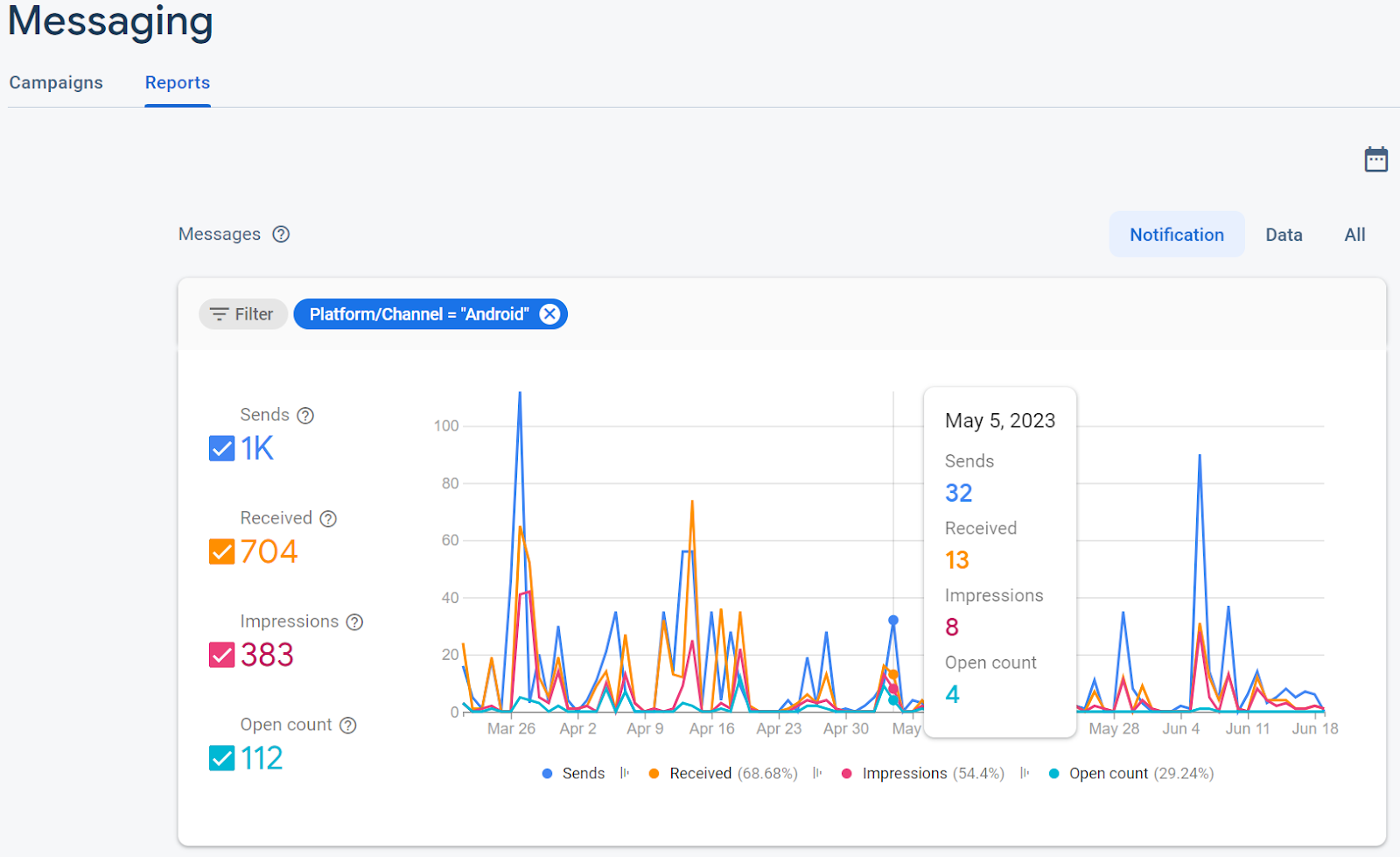 - In the Firebase console, you can view the following push analytics data per message by clicking the notification on the Campaigns tab or access the Reports tab with a graph showing funnel analysis - the number of sends, received, impressions, and opened notifications for a given timeframe. For detailed information, please take a look at Firebase cloud (push) messaging. Note that this data is not applicable if the app is using OneSignal.