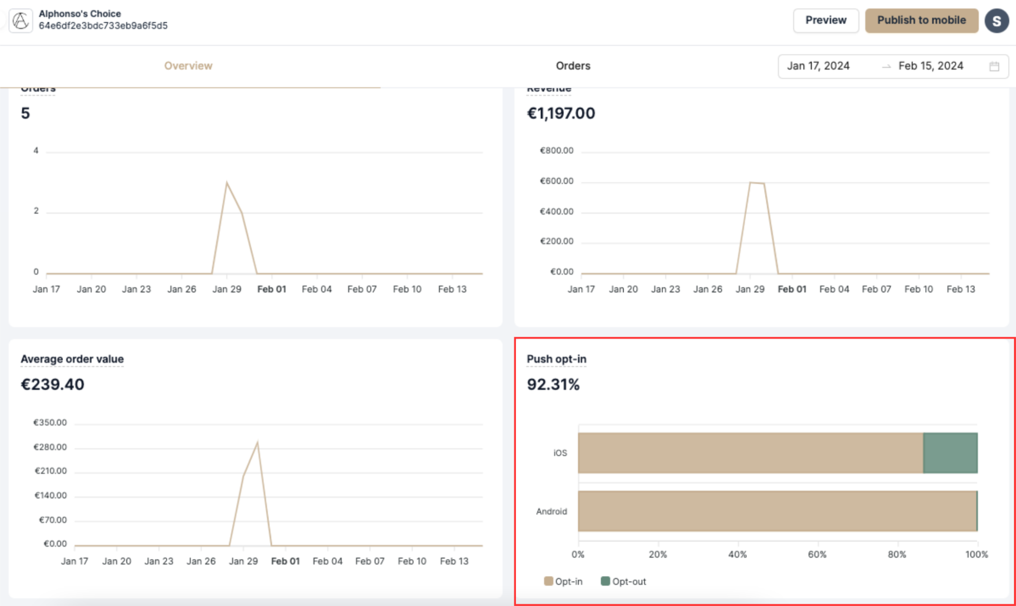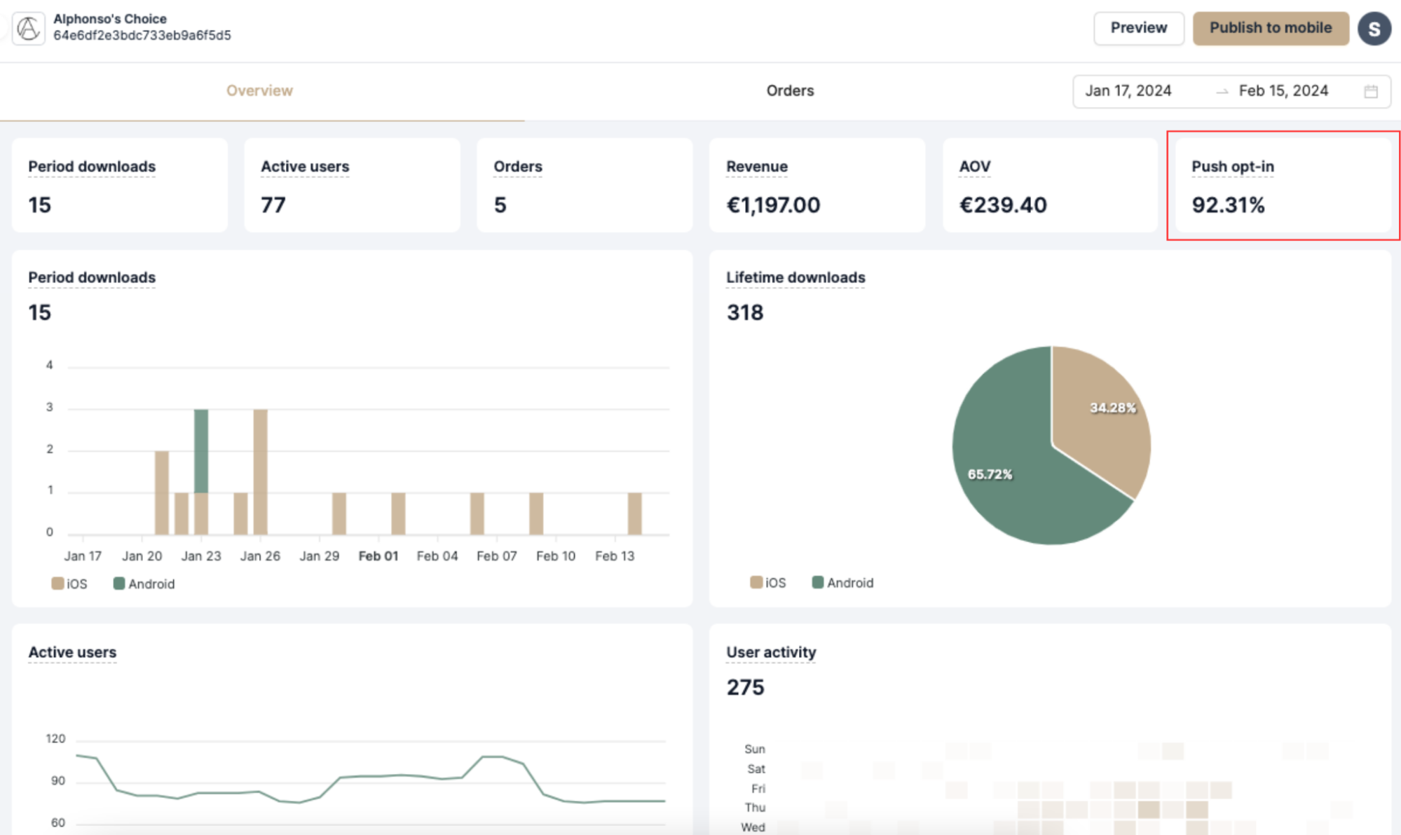 - KPI push opt-in: The percentage of users who choose to receive push notifications over the chosen period.