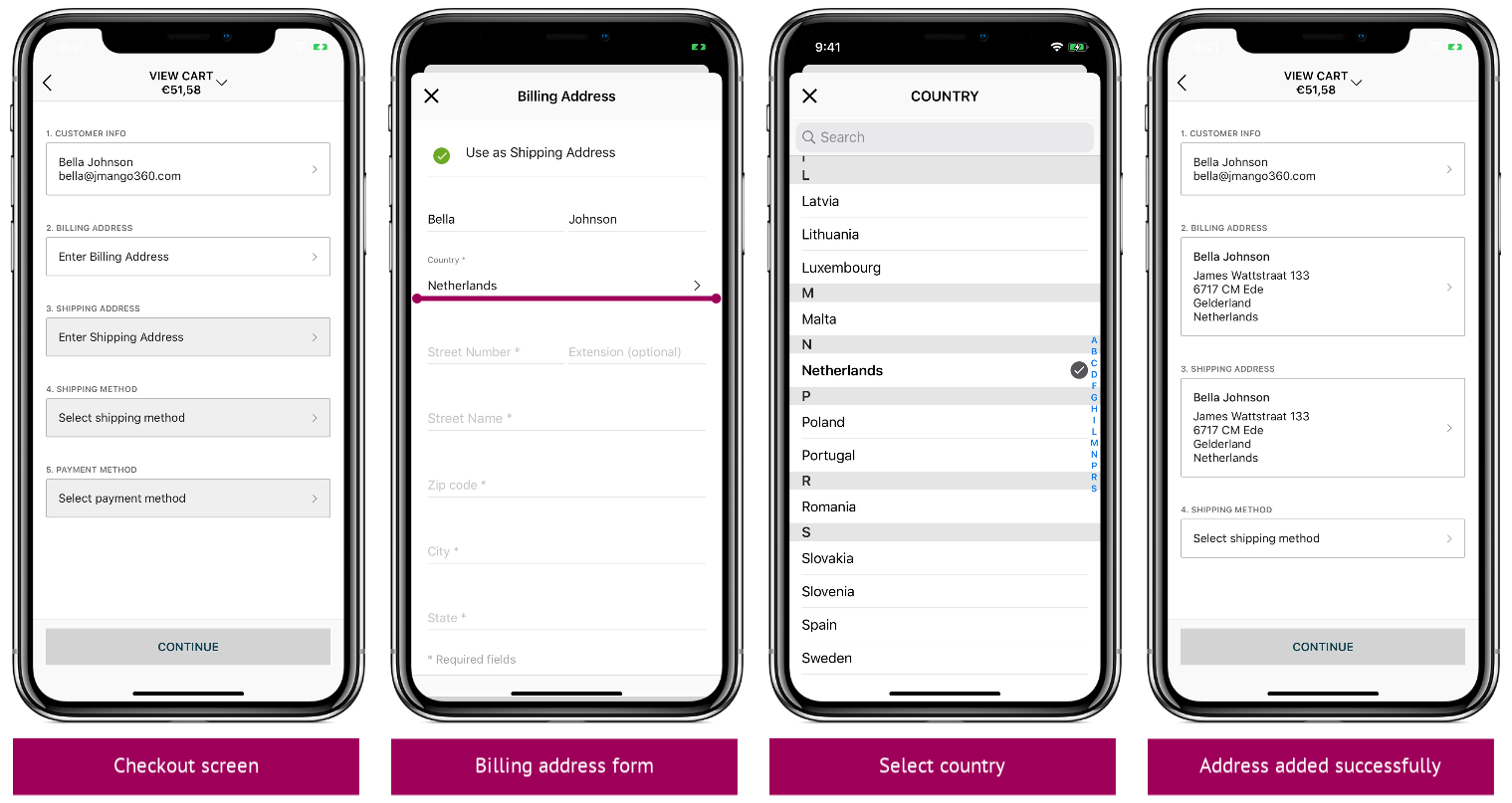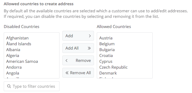 your store, you can set which countries you will accept orders from in your app. By default, all countries are available to your mobile customers to create billing and shipping addresses on app. You are able to exclude any countries you don't want in the country list to restrict the billing and shipping regions to only certain countries.