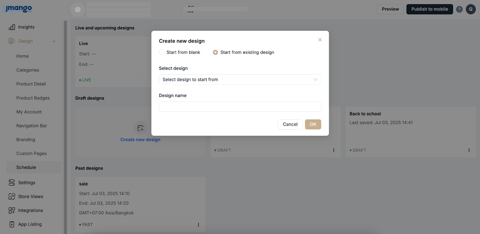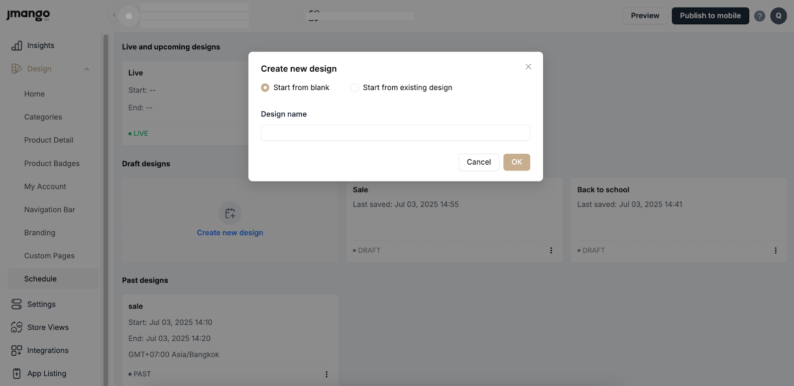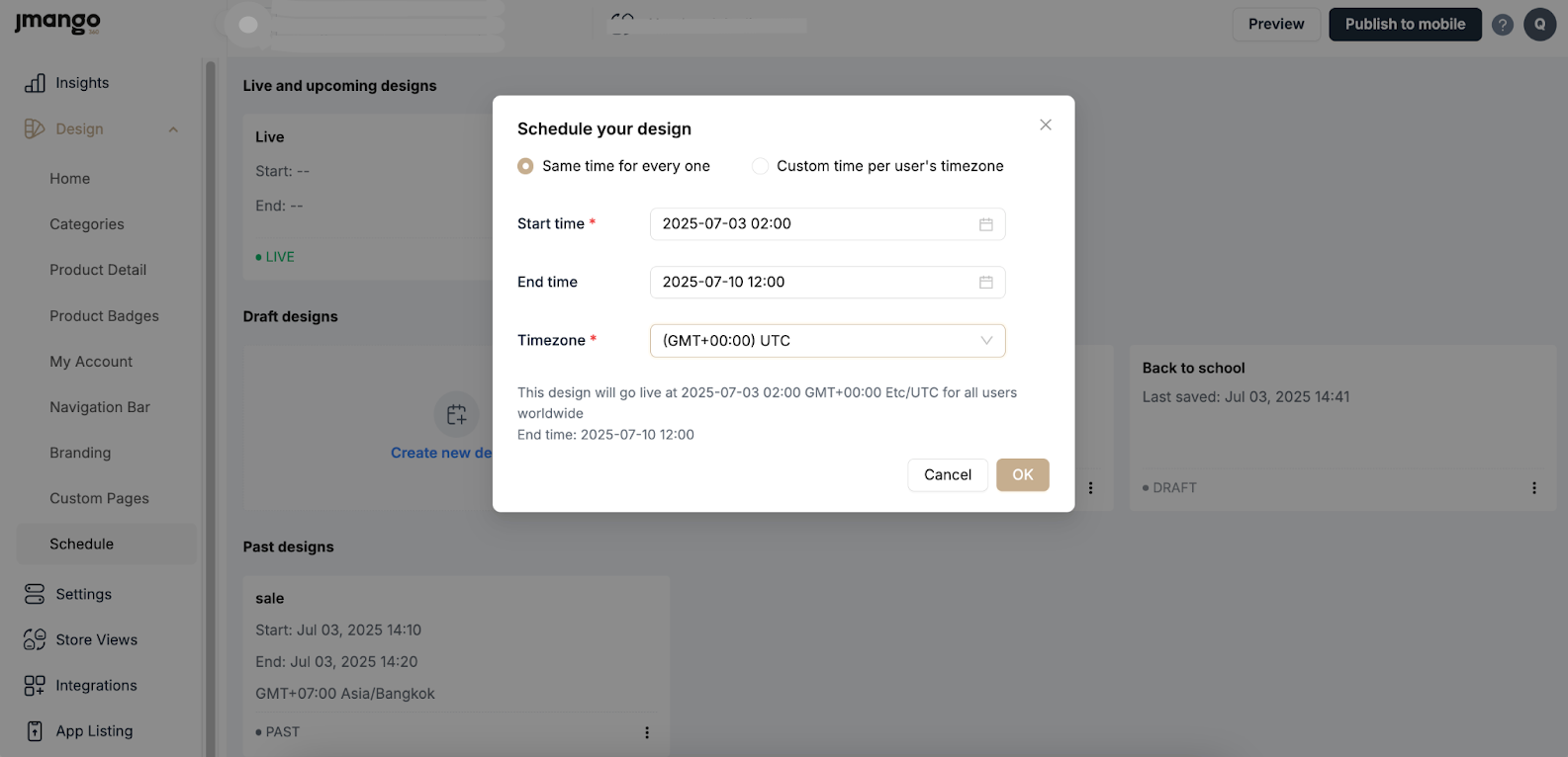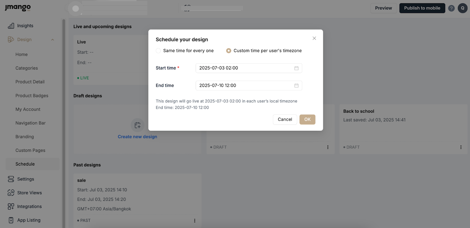 After finalizing your homepage design in draft mode, you have two options to make it available to app users: Schedule it for later or Publish it immediately.