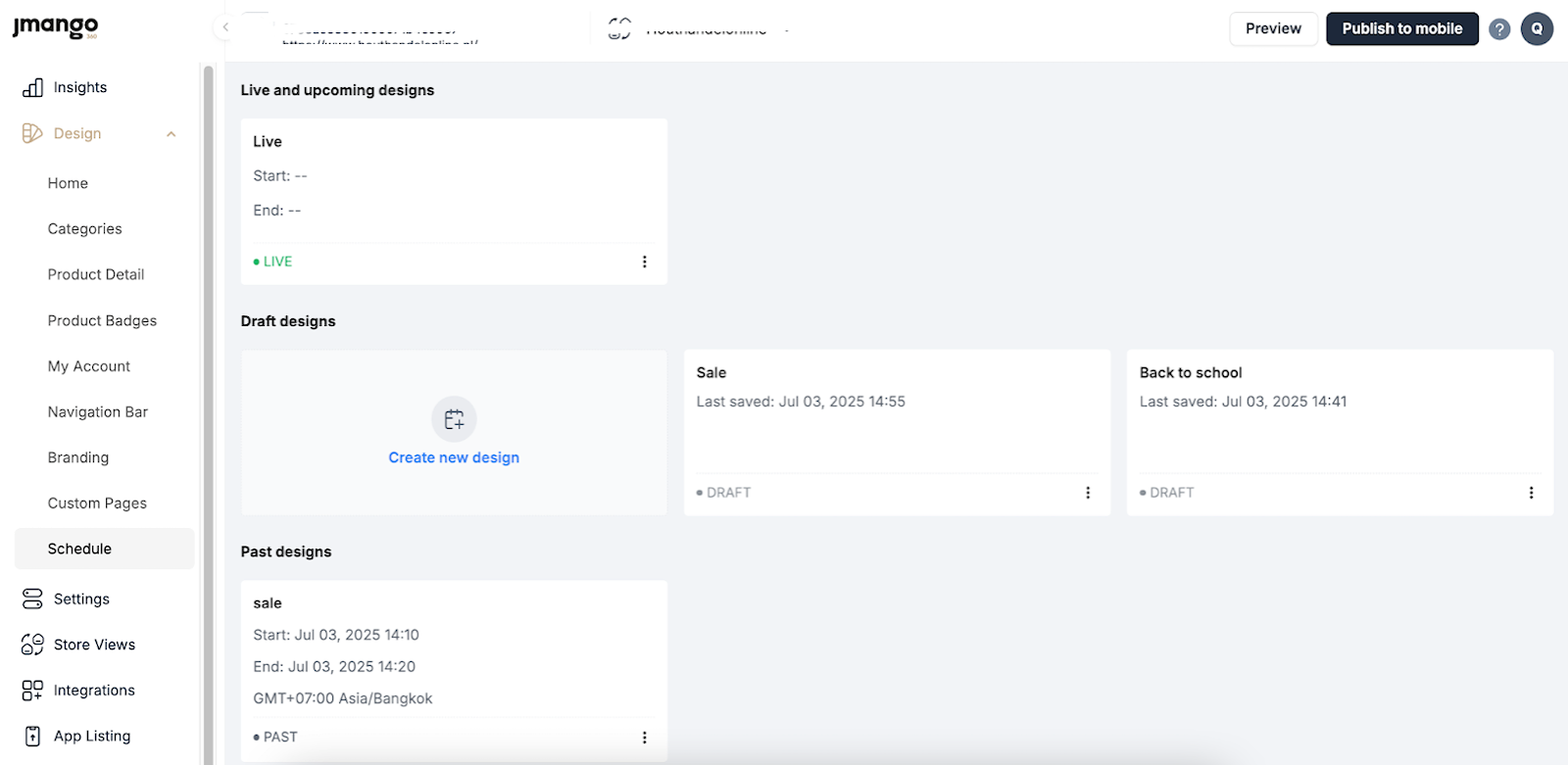 Upcoming designs: These designs are scheduled to go live at a future time.