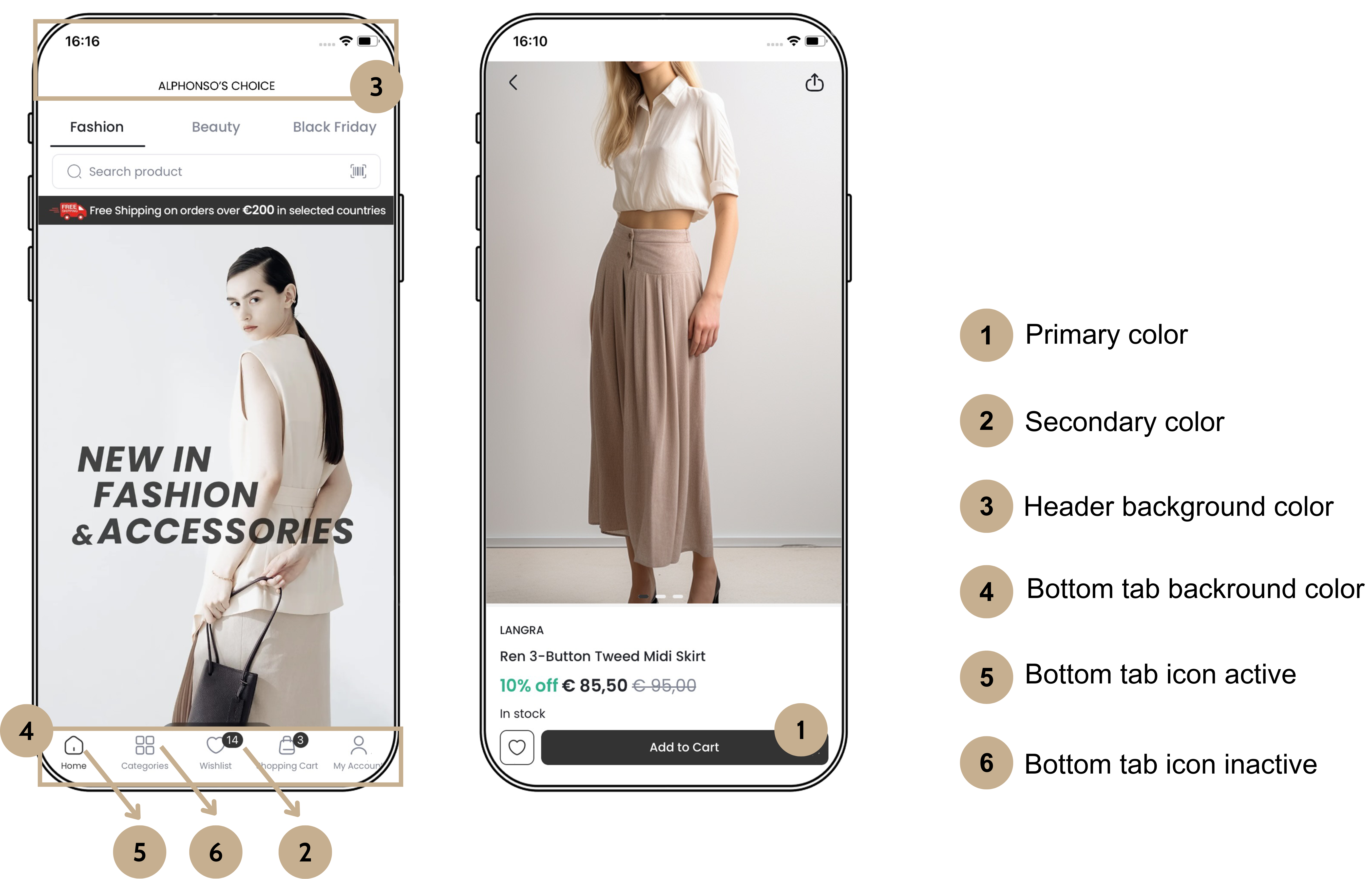- Bottom tab icon active: Set the color for the icon and label in the active bottom tab.