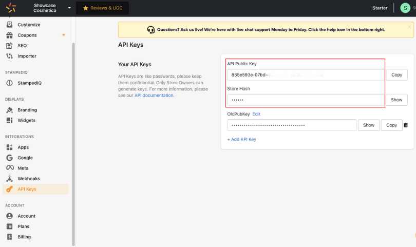 - You’ll find the API Public Key and Store Hash, and copy them.
