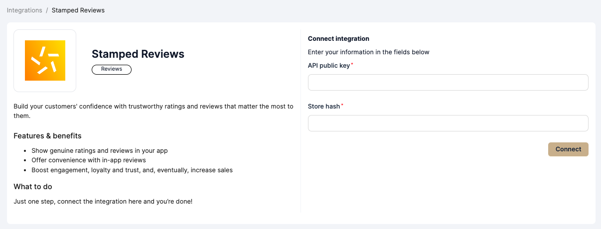 - Paste the API Public Key and Store Harsh into the fields. Finally, click Connect.