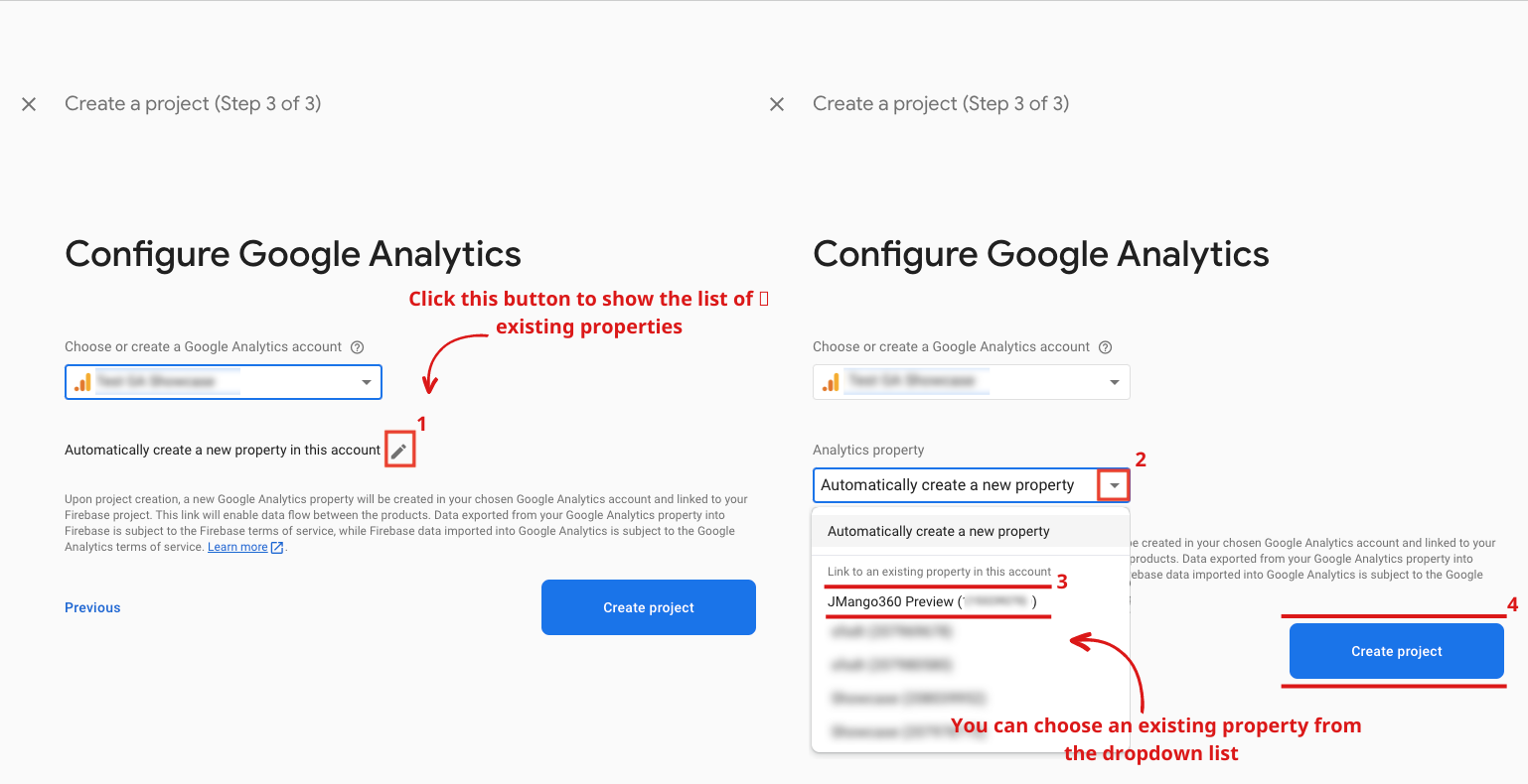 - If you want to use Google Analytics 4, ensure your account has the Google Analytics 4 property enabled. Then select the Google Analytics account you want to connect to the Firebase project. (You can refer steps as shown below)
