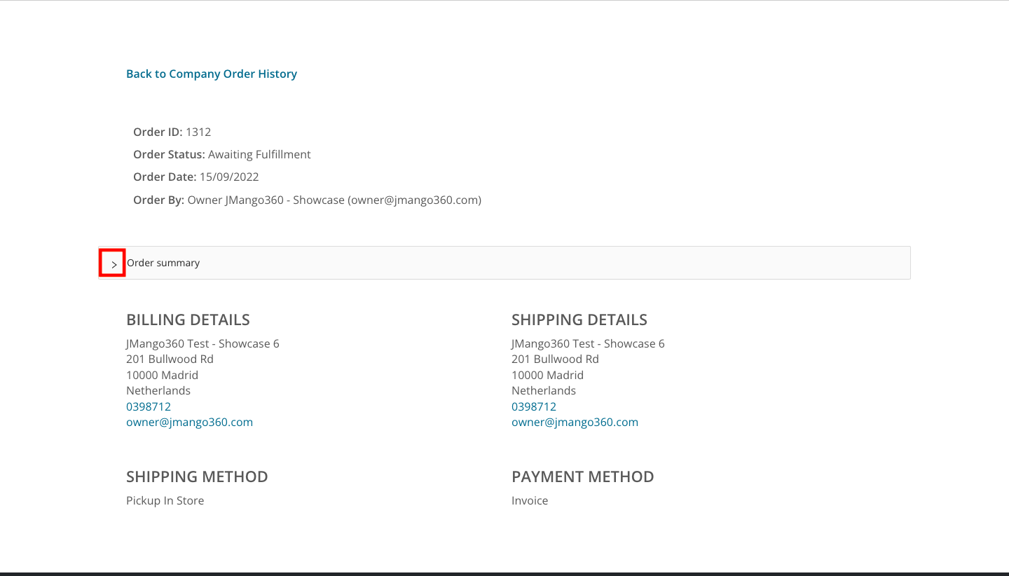 To view the Order summary, click on the dropdown button in the order detail’s Order summary section.