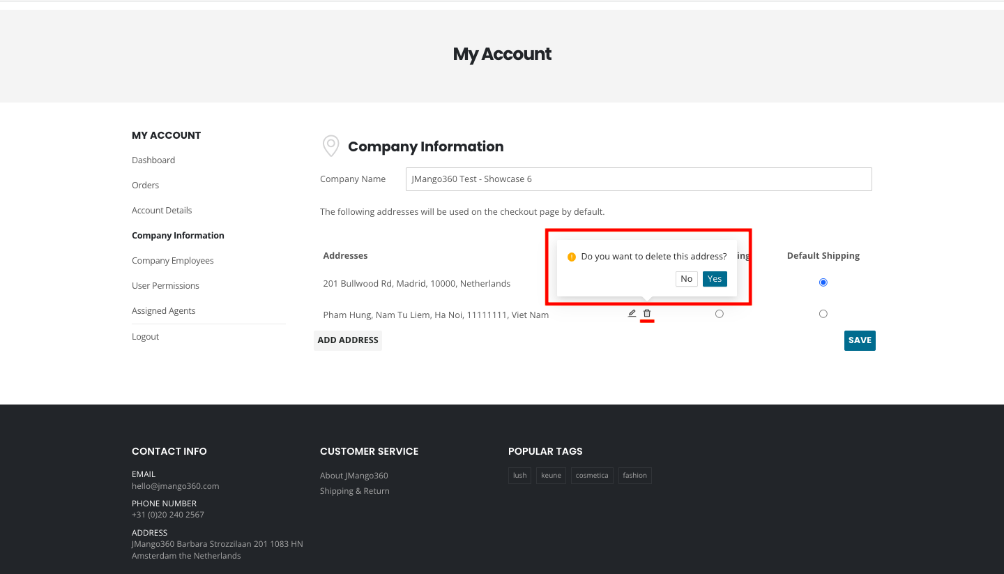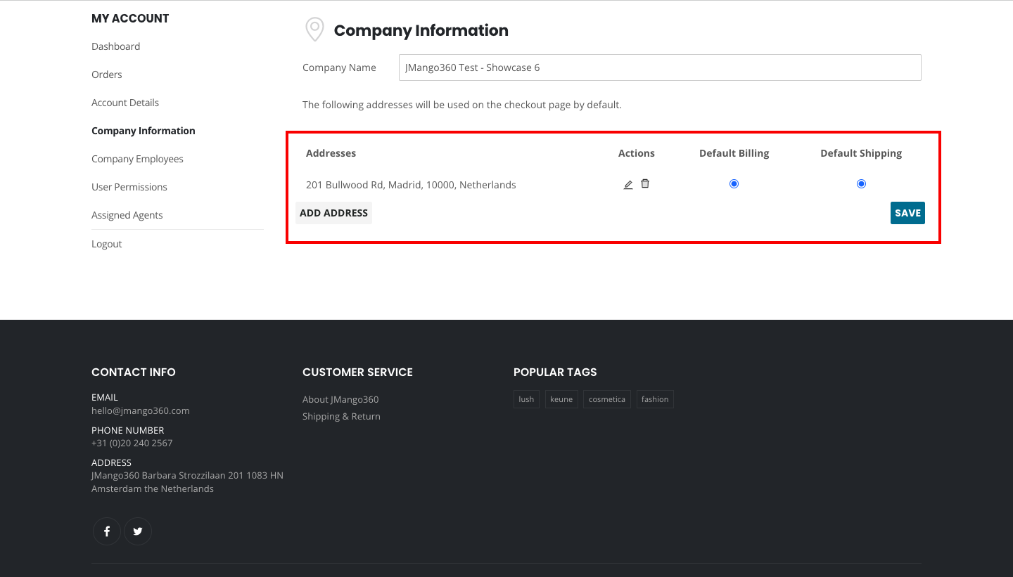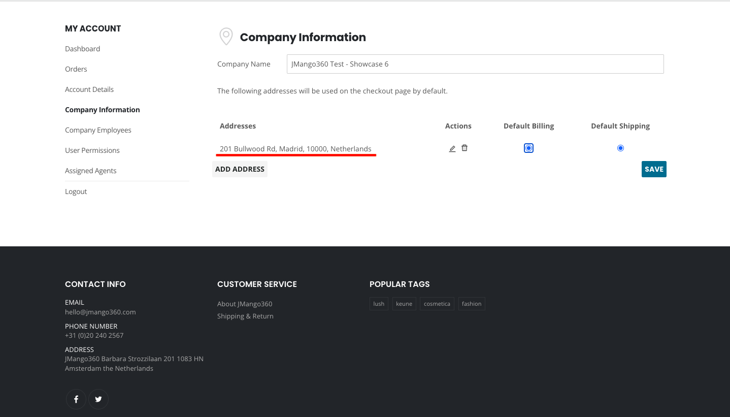 B2B Buyer can edit Company name and addresses here. B2B Employees can only view this screen.