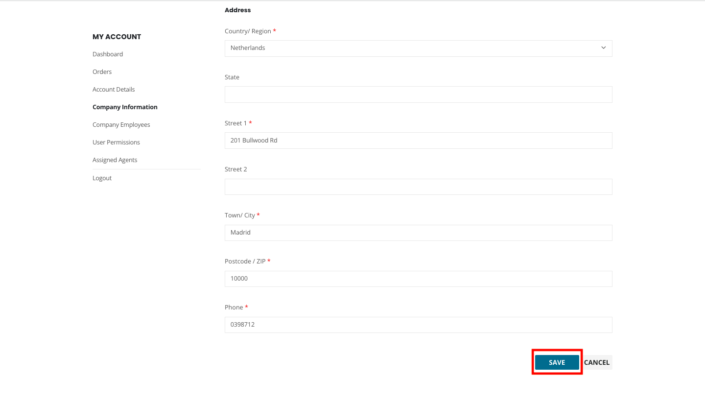 How: Login as a B2B Buyer, navigate Account > Company Information. In column Actions, click the Edit button. After editing data, click Save to save changes.