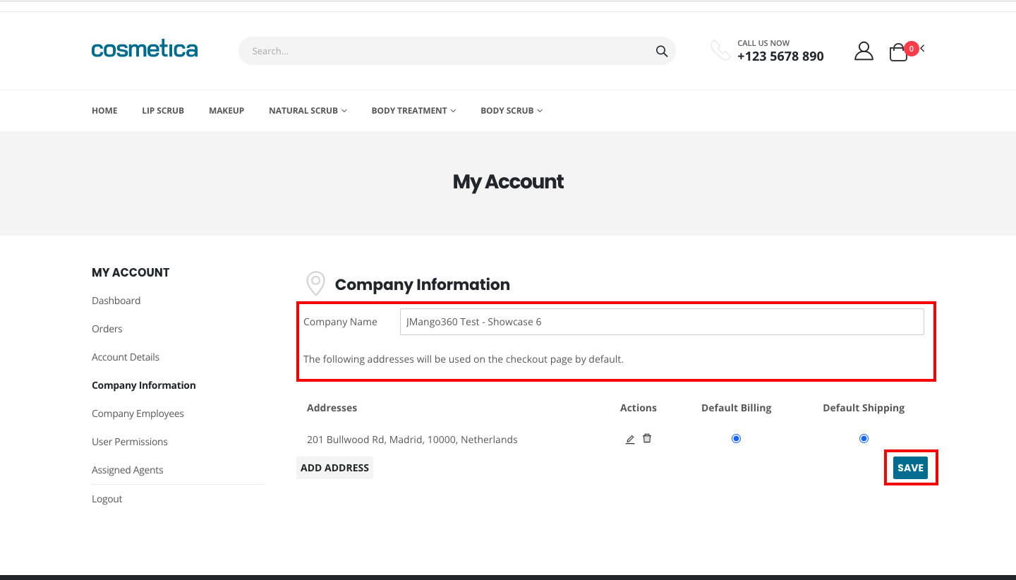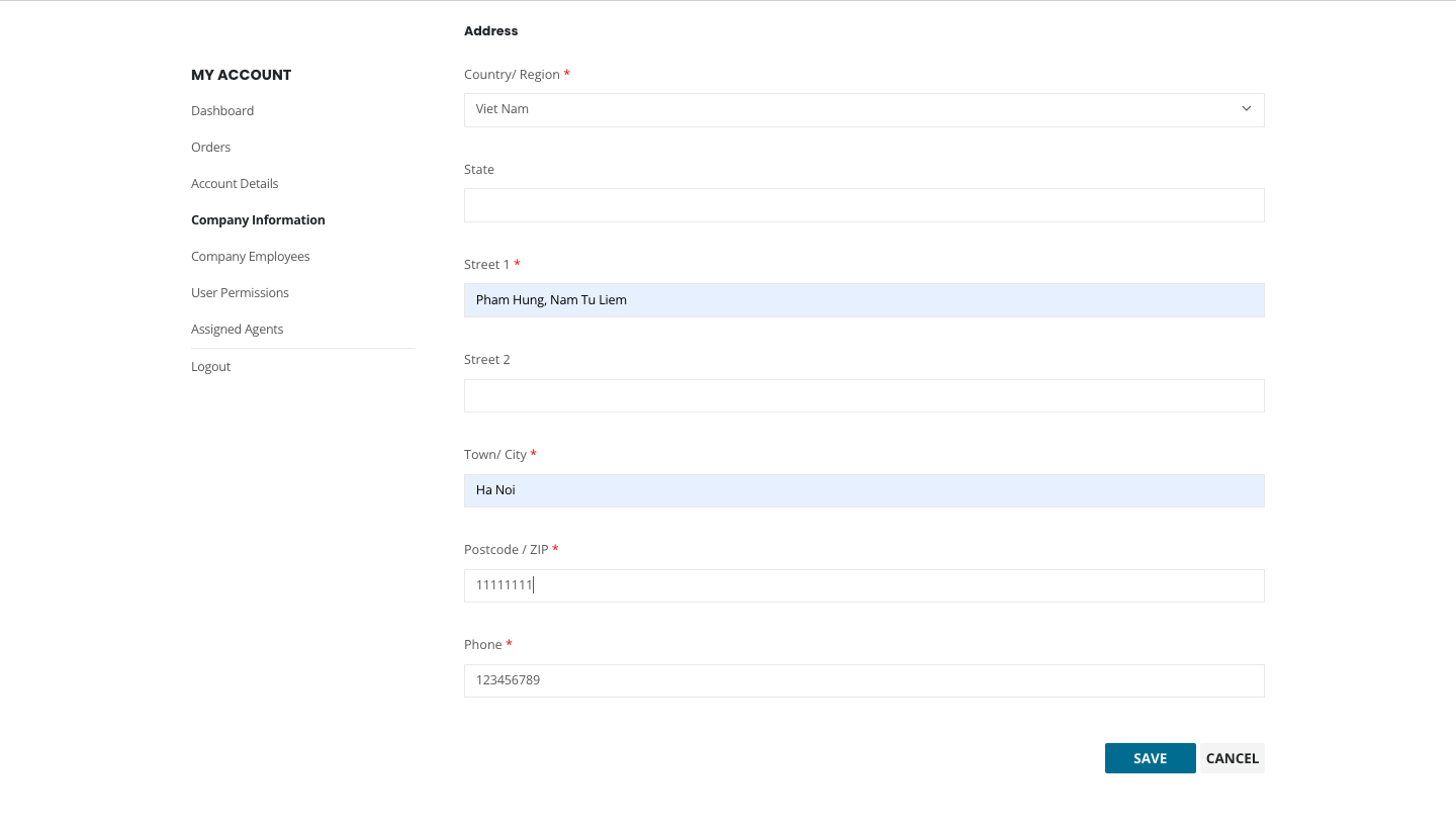How: Login as a B2B Buyer, navigate Account > Company Information. B2B Buyer can change Company Name by entering information in the Company name fields. Then click Save to save changes.