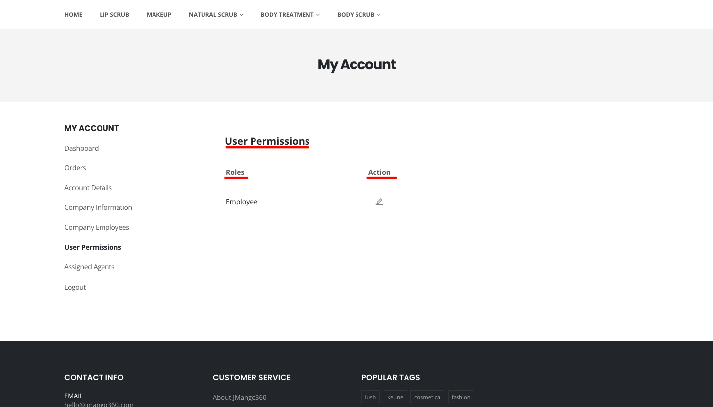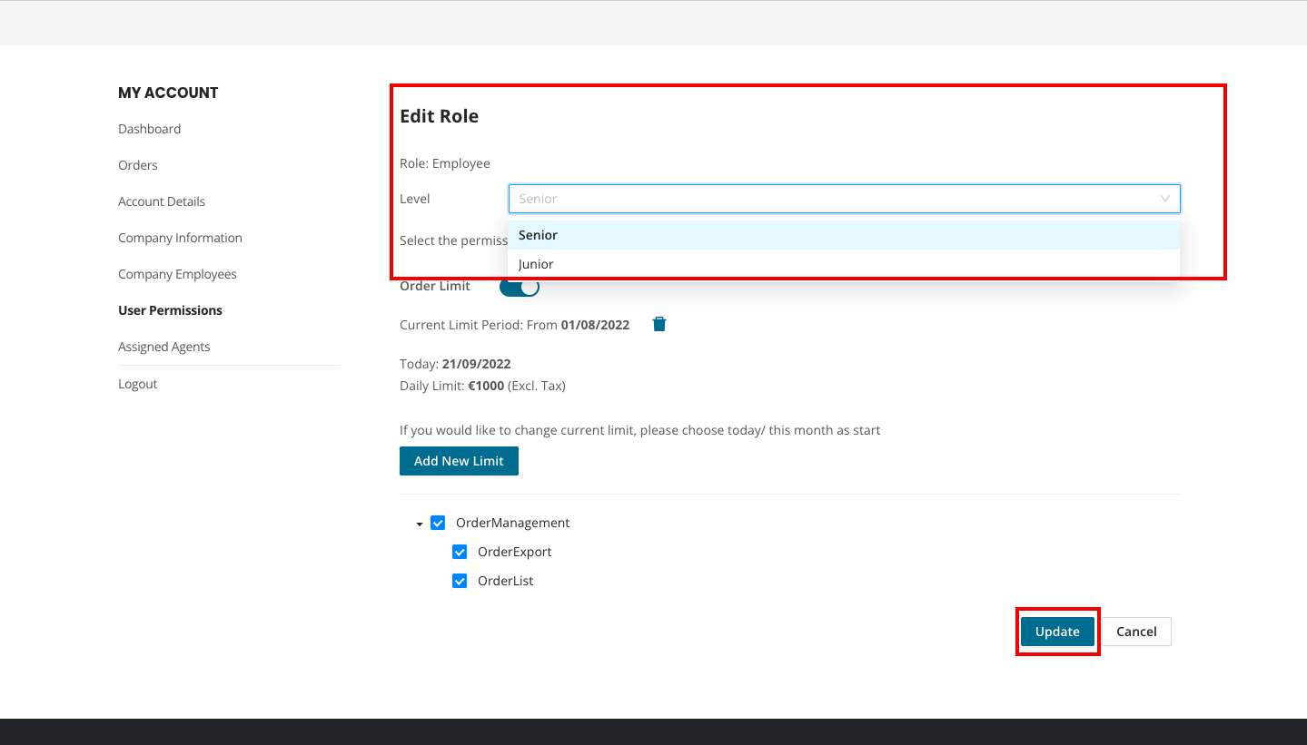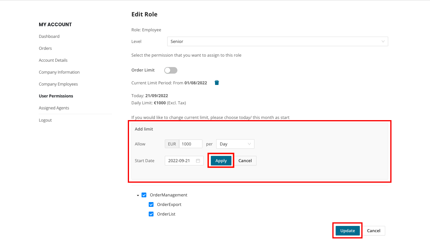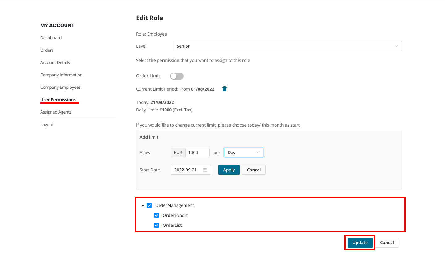How: Login as a B2B buyer, Navigate Account > User permissions. Click Edit in the Action column. B2B buyers can tick or untick checkboxes in the Permission List area and then click Update to save changes.