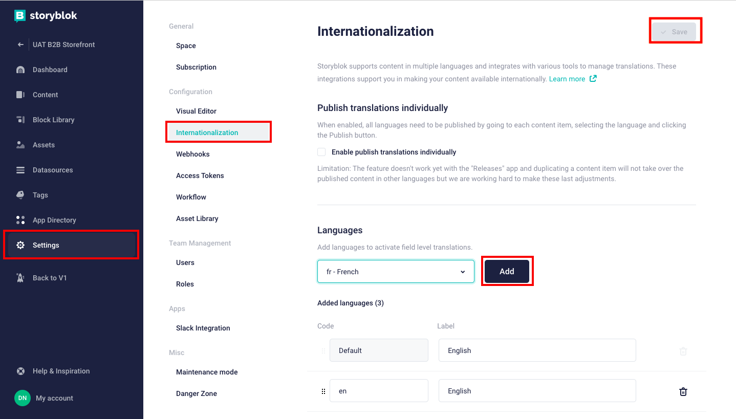 In the Languages Section, select languages users want to translate then click Add. Then click Save to save changes.