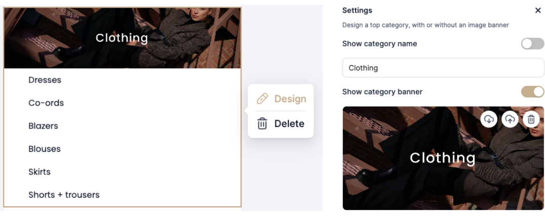 By default, the category names and banners are pulled from the e-commerce backend. You can edit the names and upload banners according to your preferences.