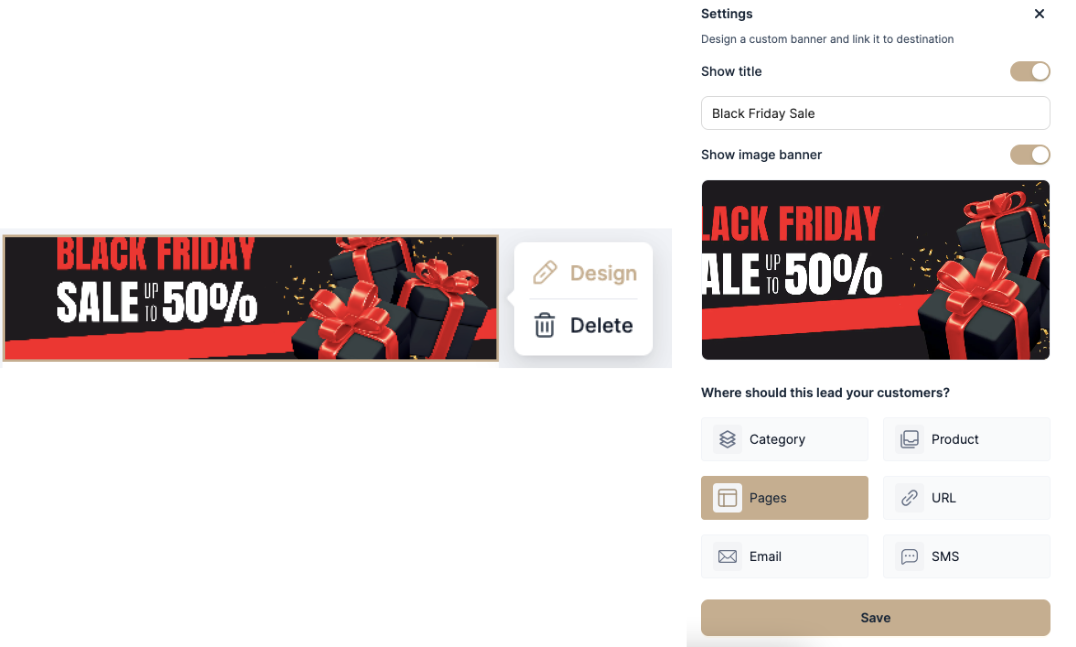 - Hover over the block and click Design. You can edit the banner name, upload an image banner, and link the block to a destination.