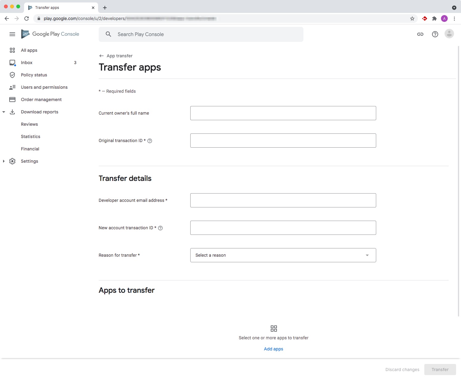 If you want to transfer your apps to a different Google Play Developer account, please submit a