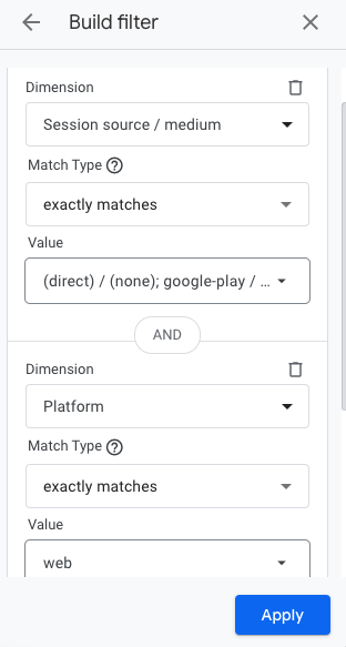 - Use the dimension Platform (in combination with the dimensions Source and Medium) to filter and/or compare all events.